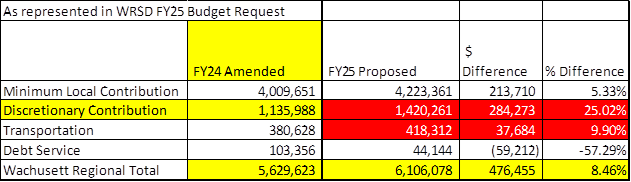 SECOND, they shifted A BIG CHUNK OF $$$ from the REAL FY 2025 “DISCRETIONARY CONTRIBUTION” REQUESTED BY THE WRSD, SHOWN FROM THE ACTUAL WRSD SPREADSHEET YEARLY “DISCRETIONARY” CONTRIBUTION PROGRESSION FROM FY 2019 TO FY 2025, including two “Amended” columns, AS BEING $1,420,261 (The xls. spreadsheet itself would not transfer to this page)–