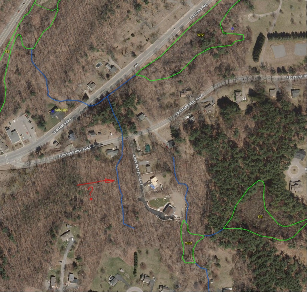 James Simpson, the son following in the footsteps of his notorious father, proposes to build two homes on land off James Patten Drive. BUT a Coldwater Fisheries Headwaters Tributary Stream flows right through that property as shown by the Commonwealth of Massachusetts Wetlands Map/Aerial Survey. Here it is: