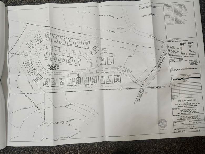 The Sterling Zoning Board of Appeals conducted its initial hearing on the completely BOGUS plan filed by Out-of-Town Blow-Ins to build 30 so-called ‘multi-family’ housing structures, all apparently duplexes, at 121-125 Flanagan Hill Road. Sterling ‘Multi-Family’ developments are governed by Sterling Zoning By-Law Section 301-4.2 et seq. SEE https://ecode360.com/37344979